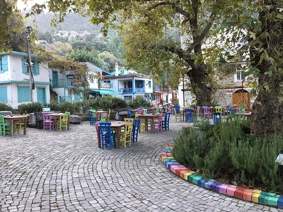 Voll ländlichen Lebens ist Bayir. Die in einem nach Westen geöffnetem Talkessel gelegene Siedlung ist von hohen Bergen umgeben. Den zentralen Punkt bildet eine uralte Platane, deren dunkle Astlöcher wie die Augenhöhlen eines Totenschädels nach Westen starren. Der belebte Platz um den Baum wird von kleinen Läden, Häusern mit türkis-blauem Anstrich sowie einer Moschee gesäumt. Viele Tische stehen hier und rundherum die bunten Stühle des Dorfcafes Çineralti Kahve. An einem Quelle füllen die Bewohner ihre Kanister mit Trinkwasser. Fast jeder hier im Dorf ist Imker. Außerdem ist die Olivenernte voll im Gange. Die Pinienwälder mit ihrem üppigen Unterwuchs leuchten in einem einzigartig hellen Grünton und unterscheiden sich deutlich vom metallischen Graugrün der Olivenhaine an den Hängen im südlichen Teil des Talkessels. Ein Geruch von Würze und Feuchtigkeit entströmt diesen Wäldern und dazu das ununterbrochene Summen der Bienen.