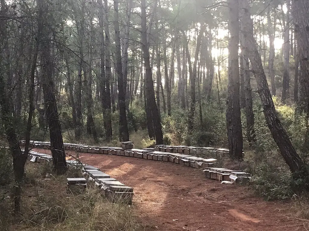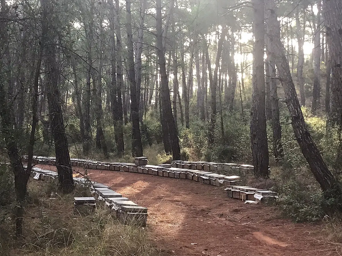 Tags darauf fahren wir noch einmal zurück nach Tasliça. An einer unglaublich schönen Stelle, die den Blick auf die Bucht von Gökova freigibt, stehen in drei langen Reihen, bogenförmig angeordnet, weißlackierte Bienenvölker. Ein mythischer Ort und wohl der schönste Platz, den sich ein Imker für seine Bienen ausdenken kann. ♦